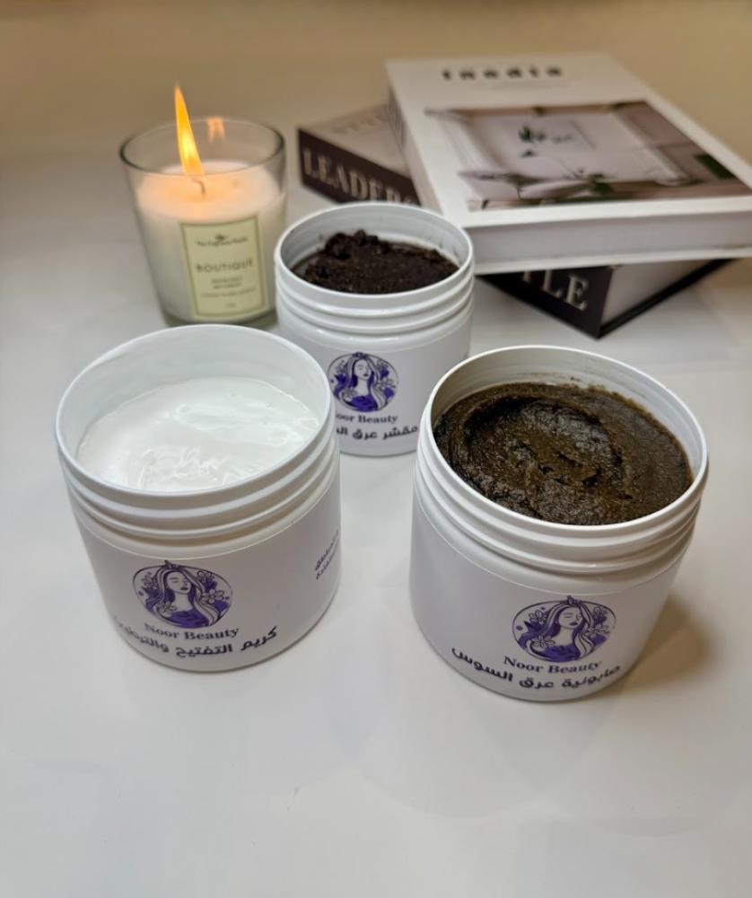 - مسحوق ألفا اربوتين ومستخلص عرق السوس والكولاجين وحمض الهايلورنيك أسيد و الزيوت الطبيعية و زبده الشيا و الكاكاو للترطيب العميق و تخفيف التشققات